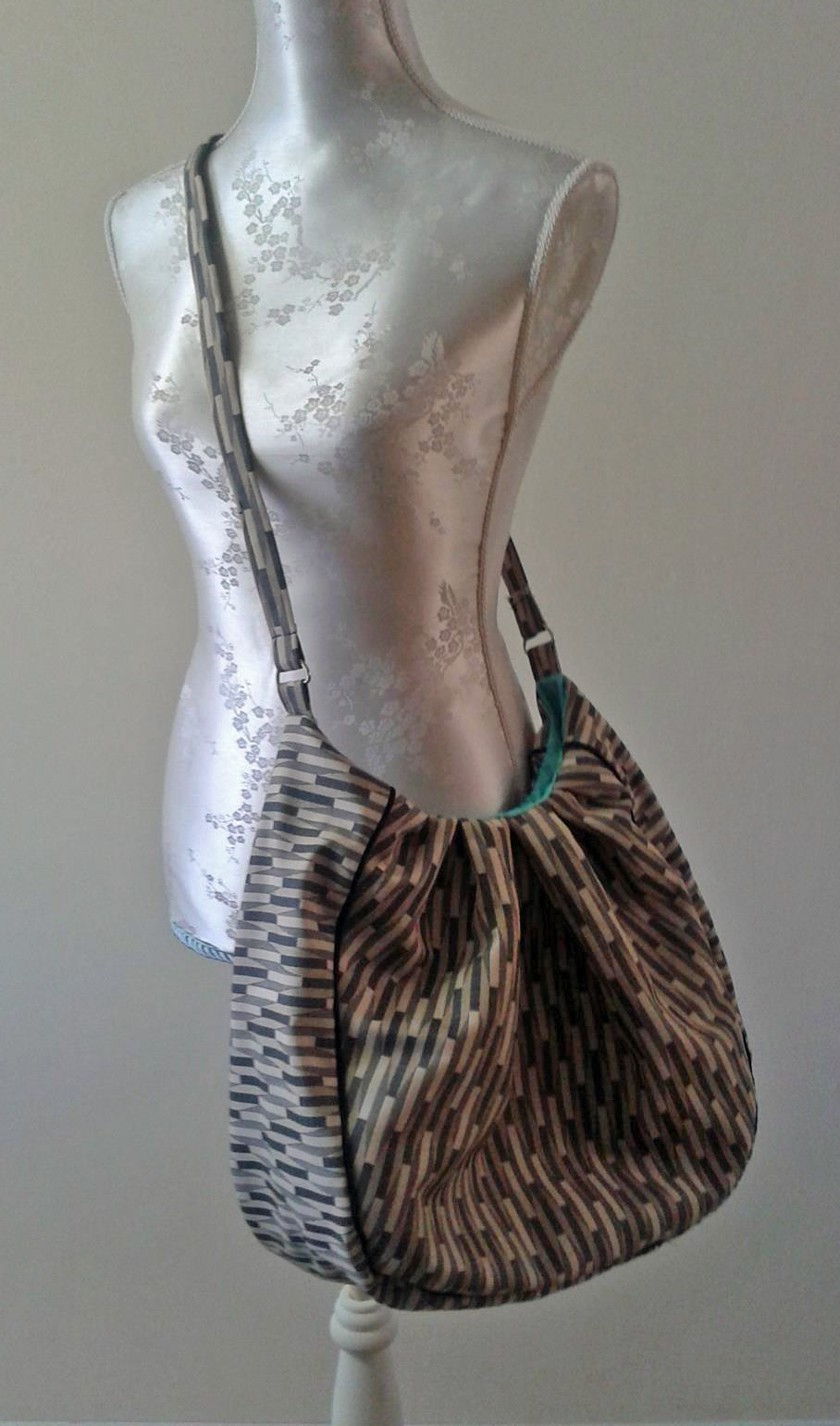 Eine Umhängetasche mit Falten und Futter in Kontrastfarbe. Dieses Modell war gar nicht so einfach zu nähen… um so stolzer hielt die Designerin ihre fertige Tasche in den Händen.