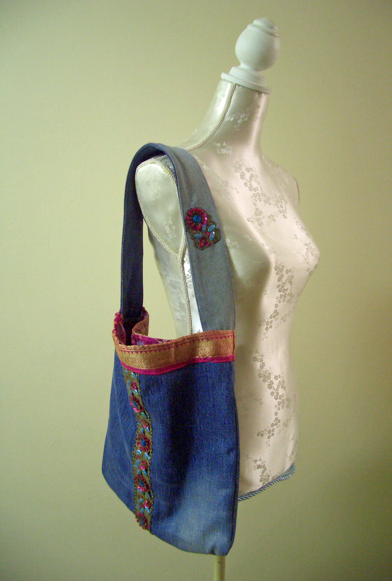 Die schicke Tasche wurde aus gesammelten Stoffen und Borten zusammen gestellt. Der bunte indische Stoff stellt einen tollen Kontrast zu dem schlichten Jeansstoff dar. Den letzten Schliff bekam das Accessoire durch die glitzernde Borte.