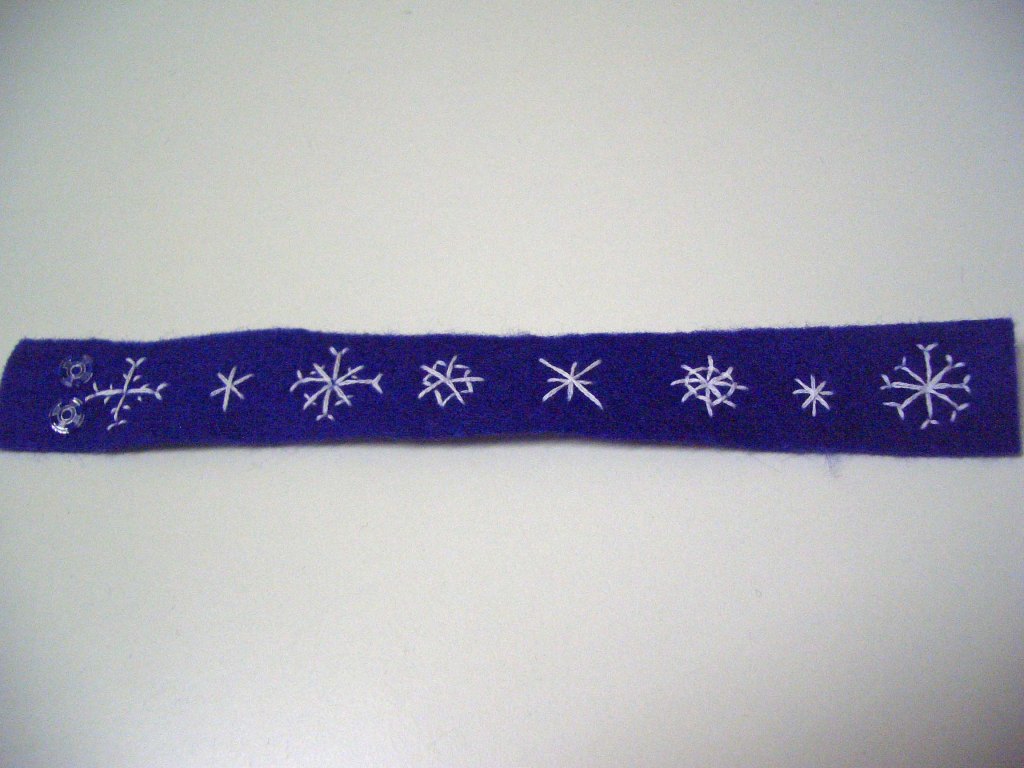 - Markiere nun die Mittelpunkte der Schneeflocken in regelmäßigen Abständen, z.B. alle 2 cm. Sticke mit 2 Fäden deines Stickgarns verschiedene Schneeflocken auf das Band. Lass deiner Fantasie freien Lauf! Keine Schneeflocke schaut wie die andere aus 🙂