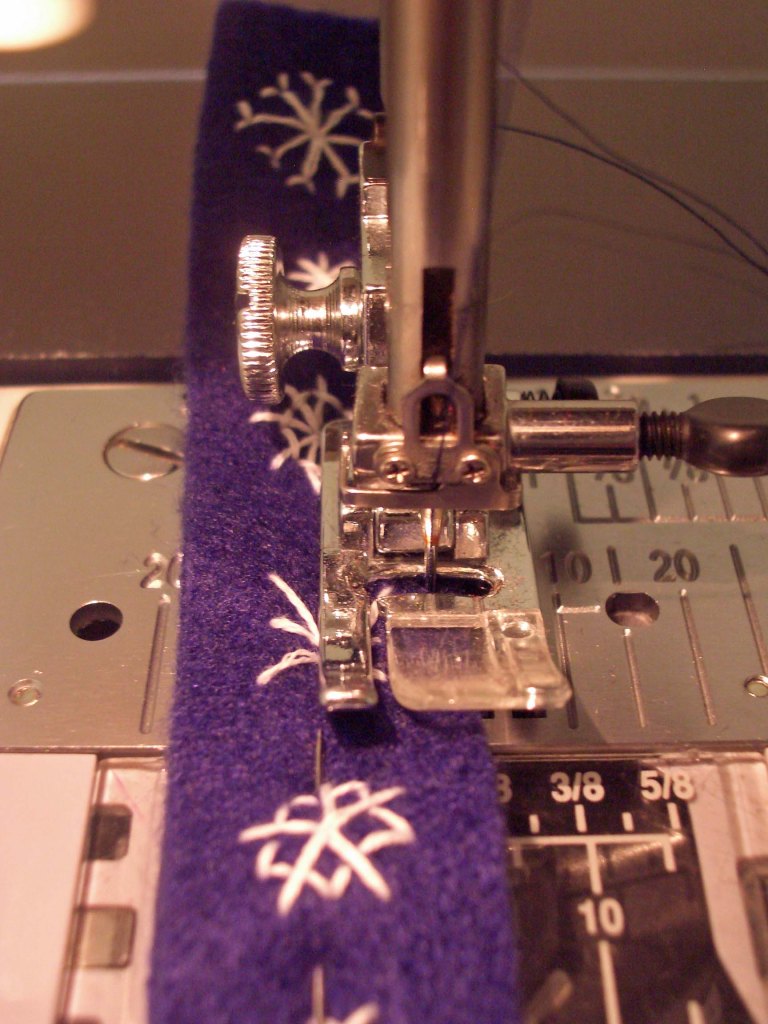 - Nähe mit der Nähmaschine an der Kante entlang einmal rundherum. Wenn du keine Nähmaschine hast, kannst du auch mit kleinen Vorstichen die beiden Streifen zusammen nähen. Die beschenkte Person wird den Aufwand sicher zu schätzen wissen.