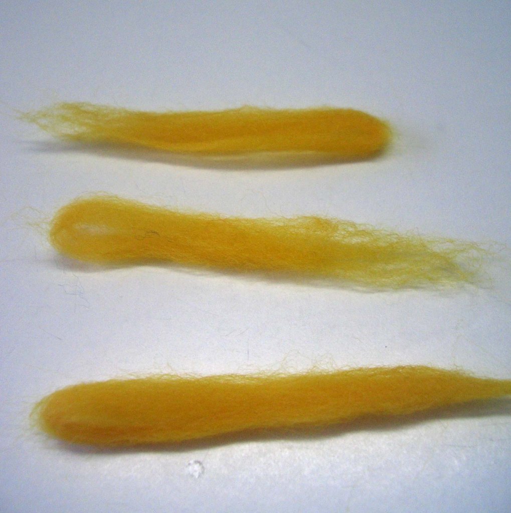 - Für den Stern zupfst du von der gelben Wolle 3 dünne Stücke ab und rollst diese zu Schlangen