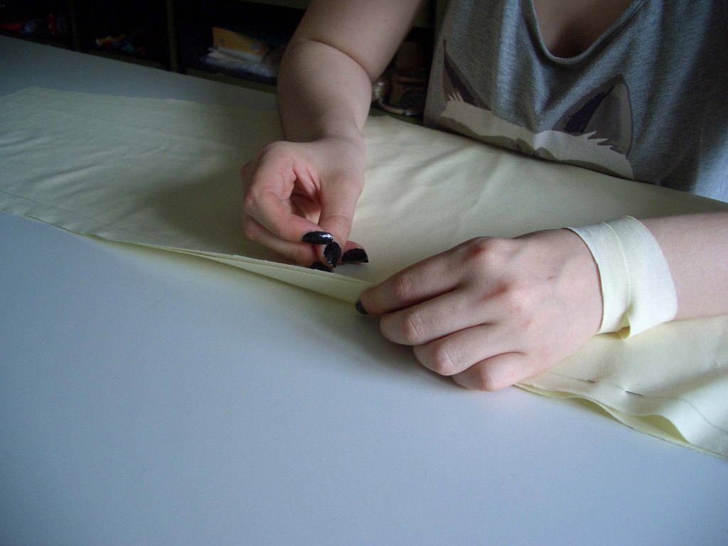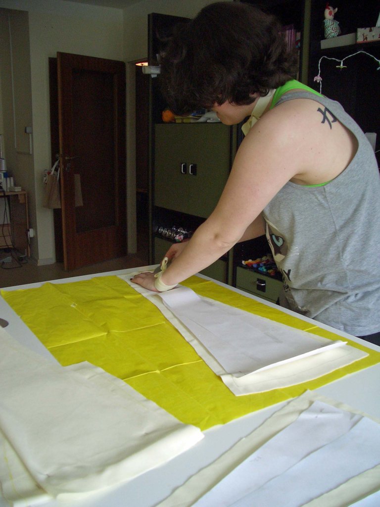 Nachdem wir den Schnitt gezeichnet haben, wurden die einzelnen Teile zugeschnitten. Aus dem gelben Stoff wird ein Kleid genäht und beim nächsten Mal folgt ein Überwurf aus einem rosa Flausch-Stoff.