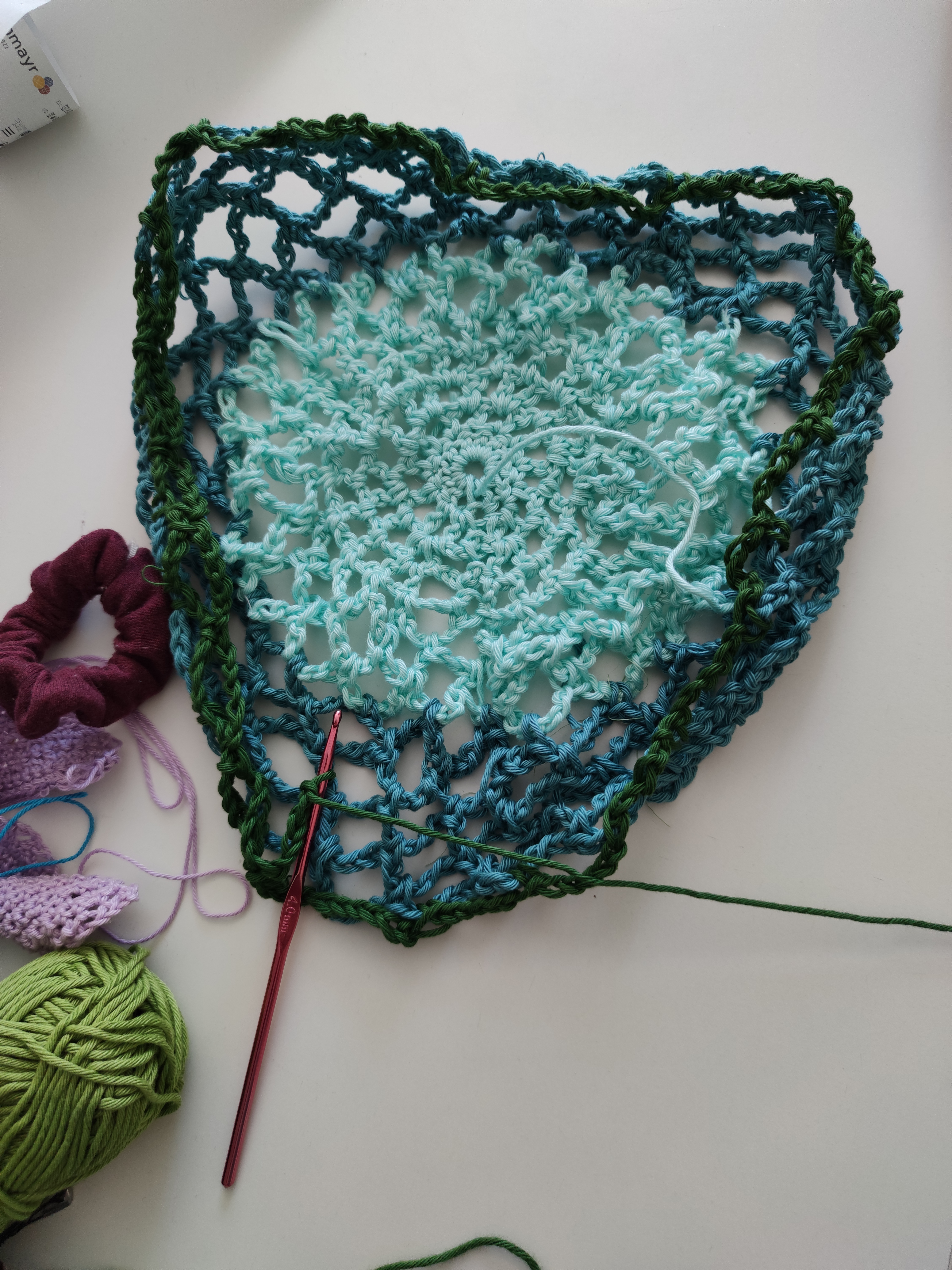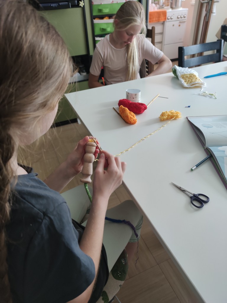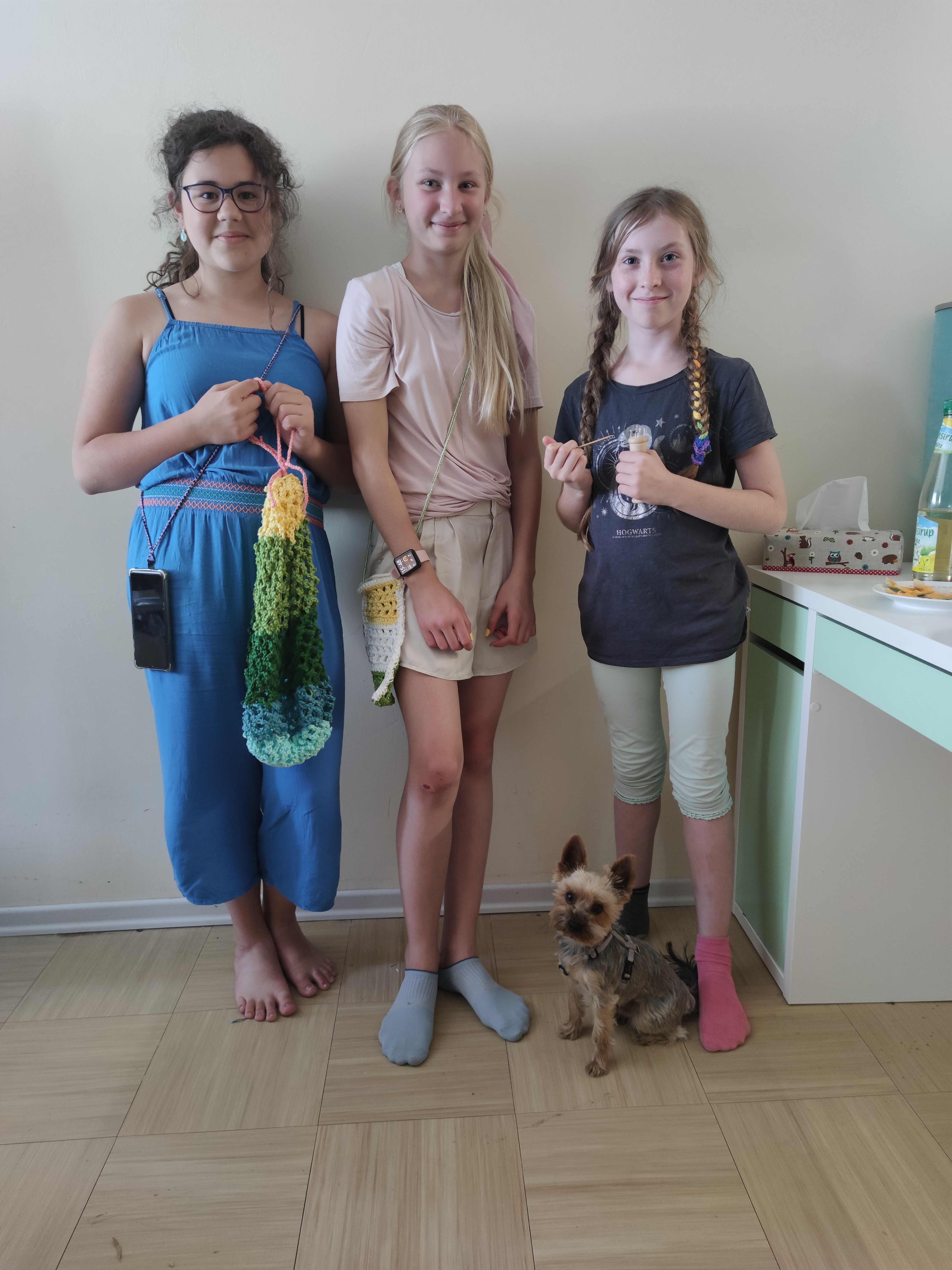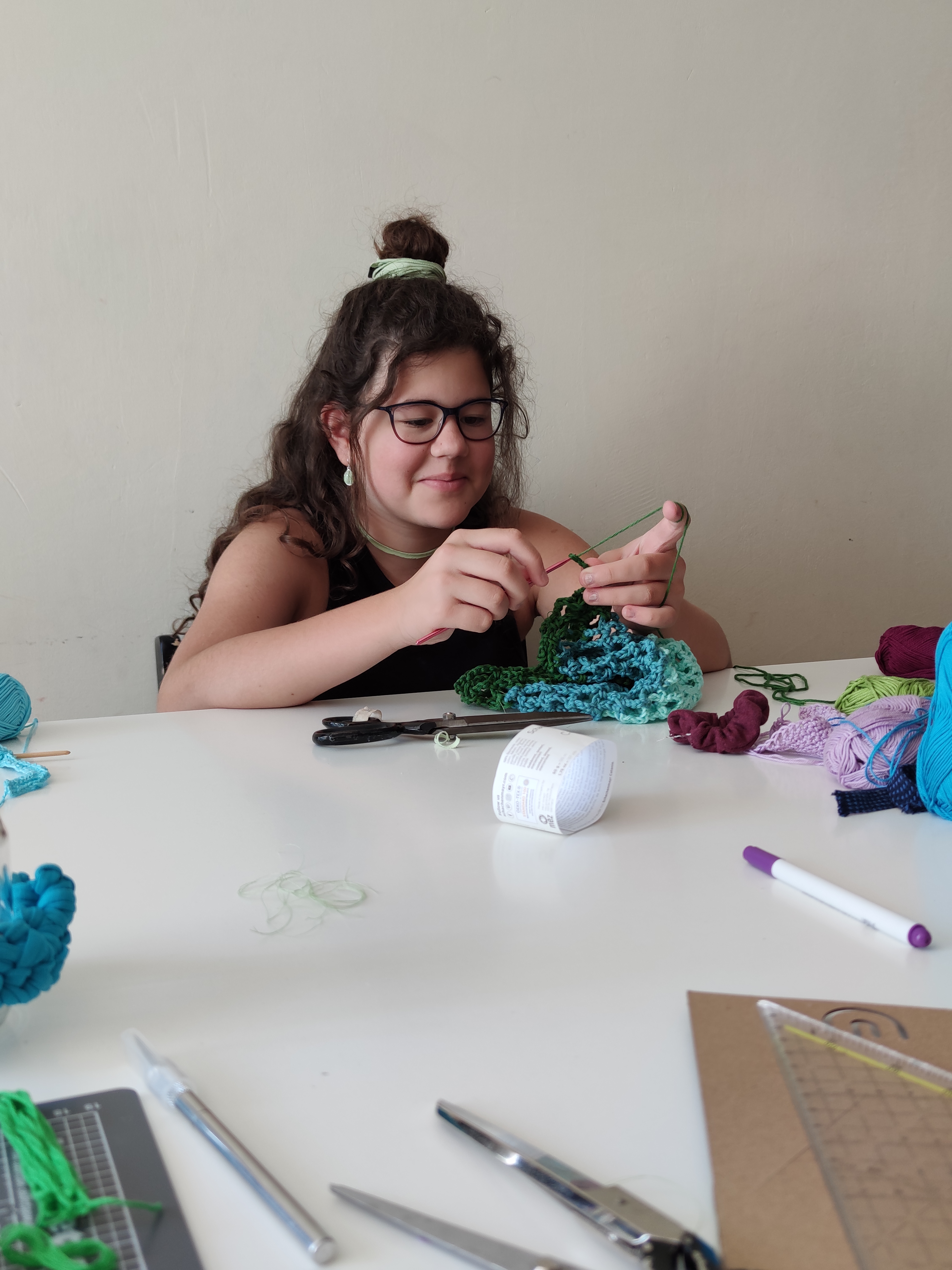 Unterschiedlichste Techniken wurden ausprobiert: Häkeln, Knüpfen, nähen mit der Overlock, Sticken,…