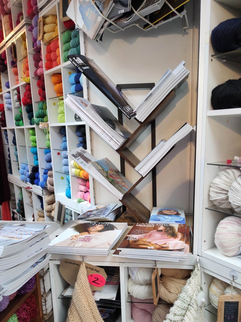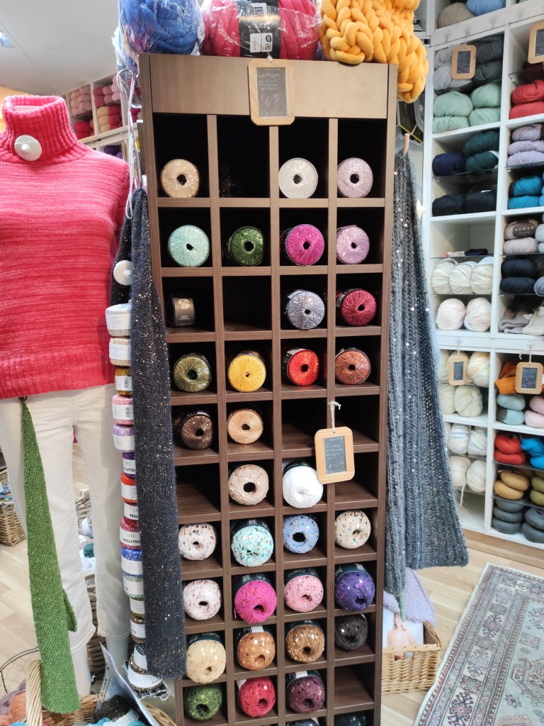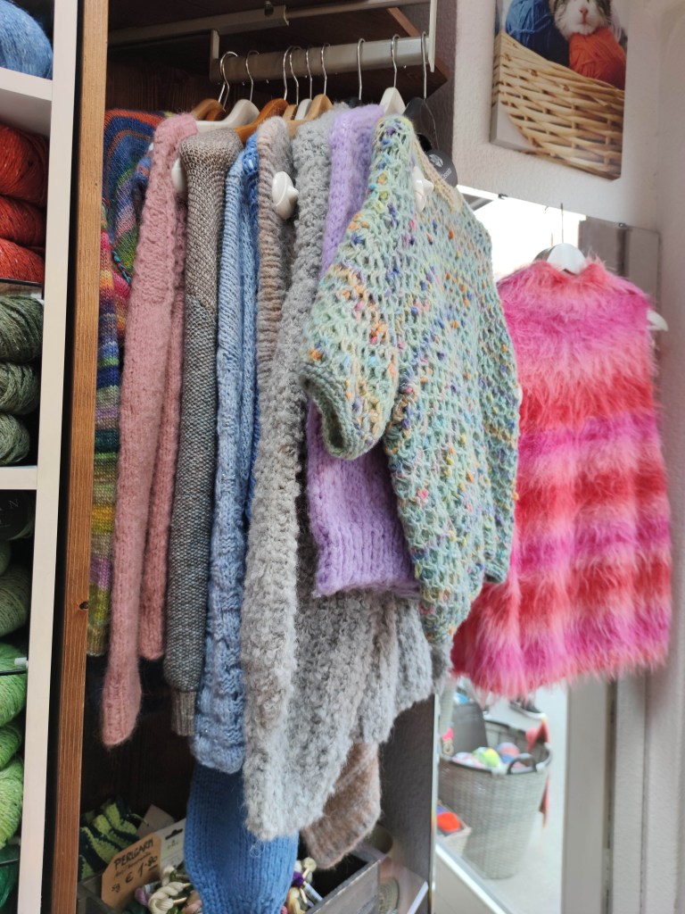Neben den vielen Strick- und Häkelgarnen werden hier auch Stickgarne, Zeitschriften mit Anleitungen und gestrickte Kleidungsstücke angeboten. Wie findest du das Glitzergarn? Passt auf jeden Fall schon für das selbstgemachte Weihnachtsoutfit.