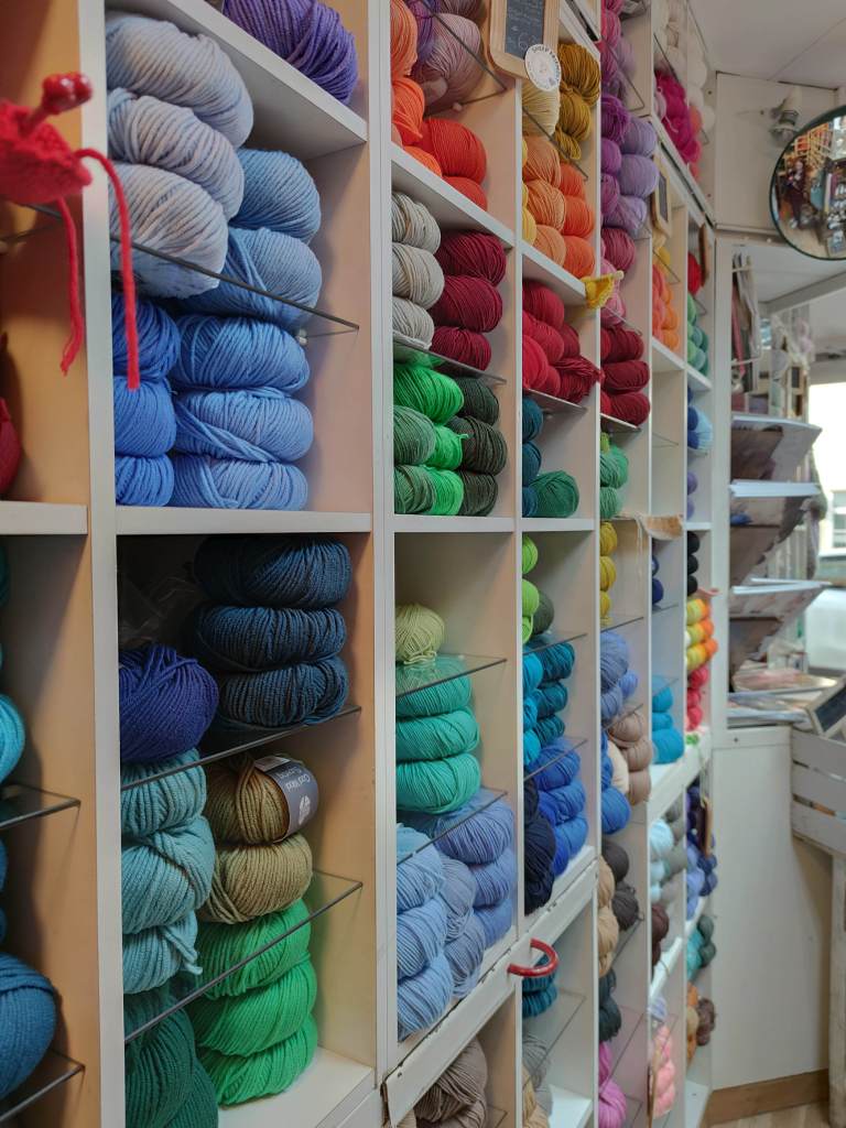 Im Laden ist es etwas eng. Einige Kunden stehen vor den vollen Regalen und bewundern die Garne, in Kisten am Boden befindet sich noch mehr Wolle!