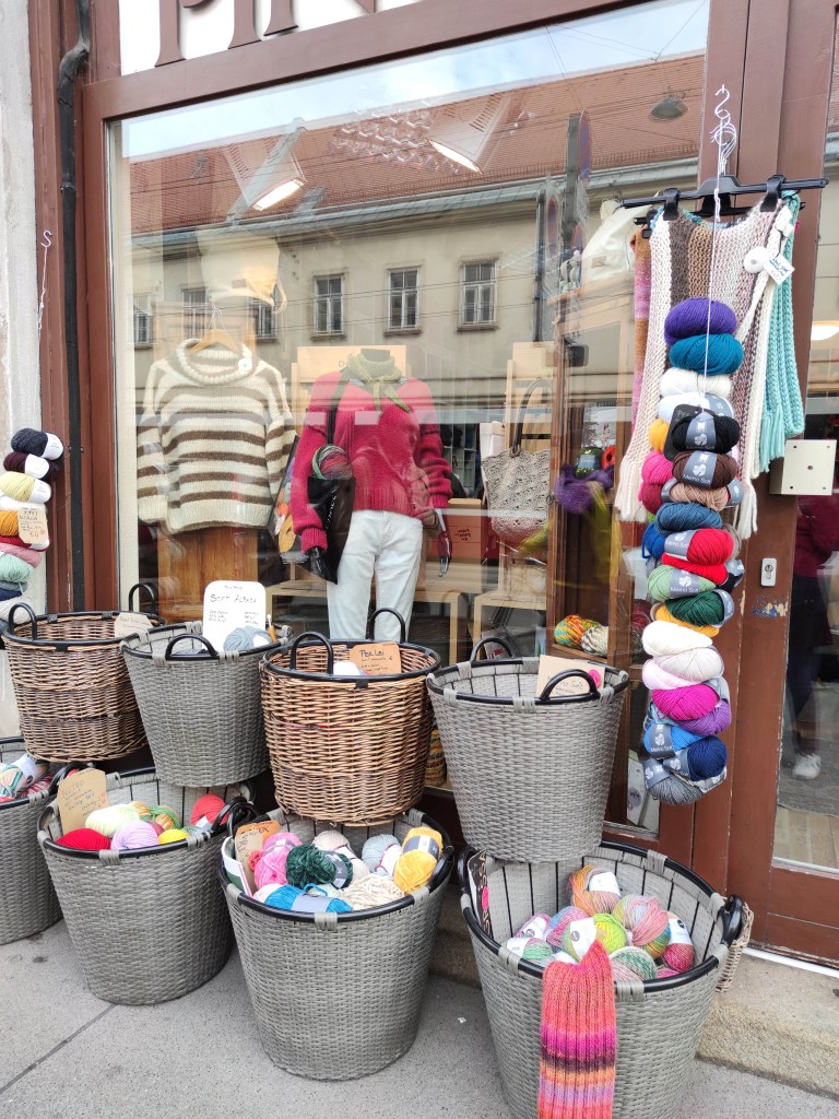 Gestern war es soweit, mit der Straßenbahn 44 oder 43 (Station Lange Gasse) ist es gar nicht weit zum Wollladen. Es ist ein wirklich kleiner, süßer Laden aber nicht zu übersehen. Gleich vor dem Schaufenster stehen große Körbe mit verschiedenen Garnen.