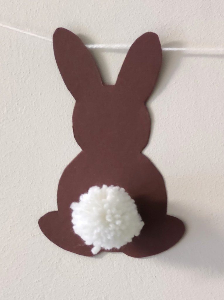 Um die Girlande fertig zu stellen, fertige nun ein paar Pompons an und schneide Hasen aus dem Fotokarton aus. Klebe die Pompons mit Bastelkleber fest und befestige die Hasen mit Tixo an einer Schnur.