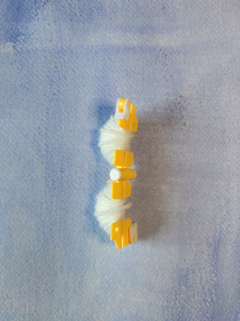 - Lege beide Teile des Pompon-Makers aneinander und wickle das Garn über beide Teile, bis die U-Form nicht mehr sichtbar ist.