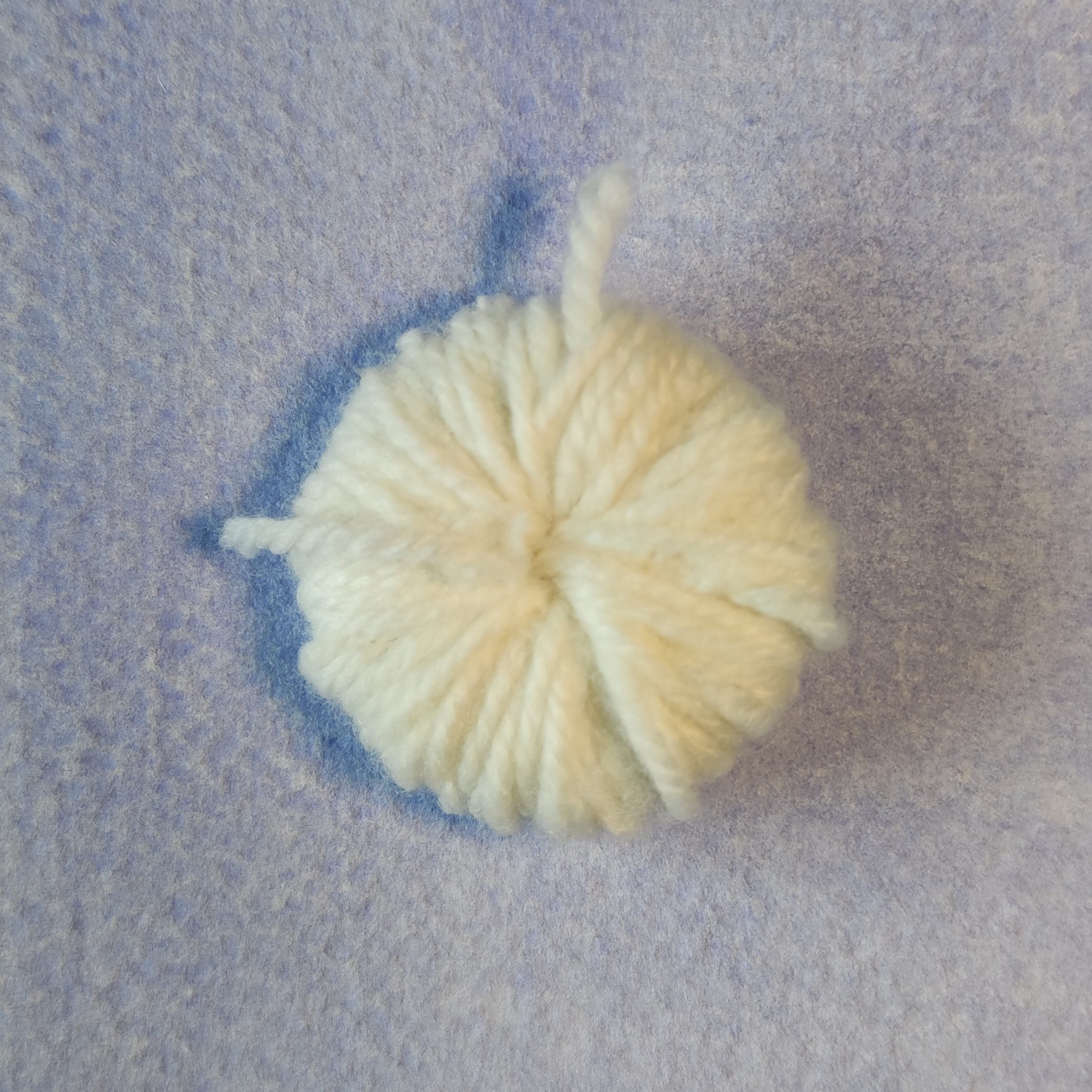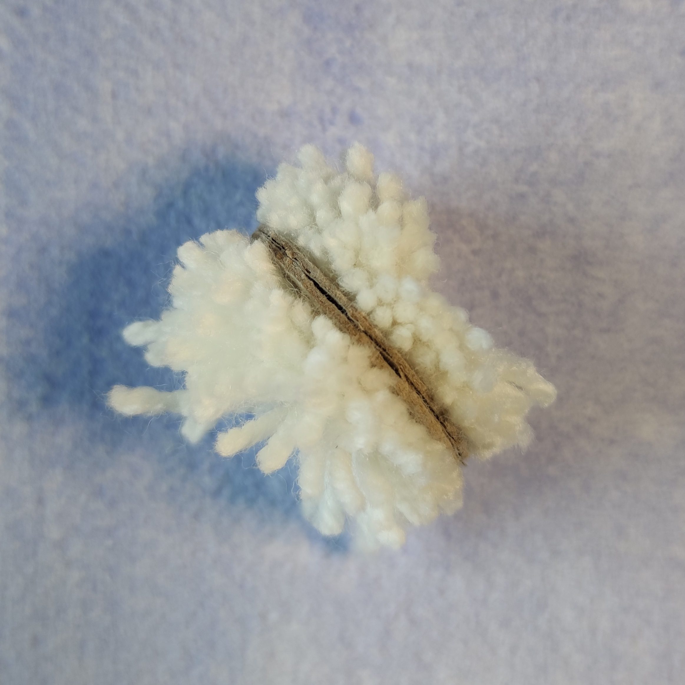 4. Schneide ein Stück Garn von deinem Wollknäuel ab und lege es in den Zwischenraum der vorhin entstanden ist. Mache nun zwei feste Knoten.