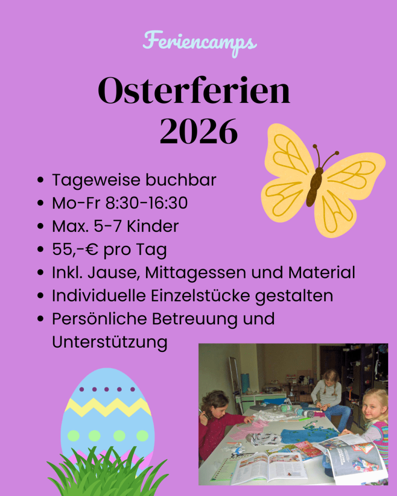 Persönliche Betreuung ist dir wichtig? Freue dich über ein Feriencamp, in dem auf die Wünsche und Fähigkeiten deines Kindes eingegangen wird. So kann es ganz in seiner Kreativität aufgehen und die Zeit im Atelier und seine Ferien genießen.